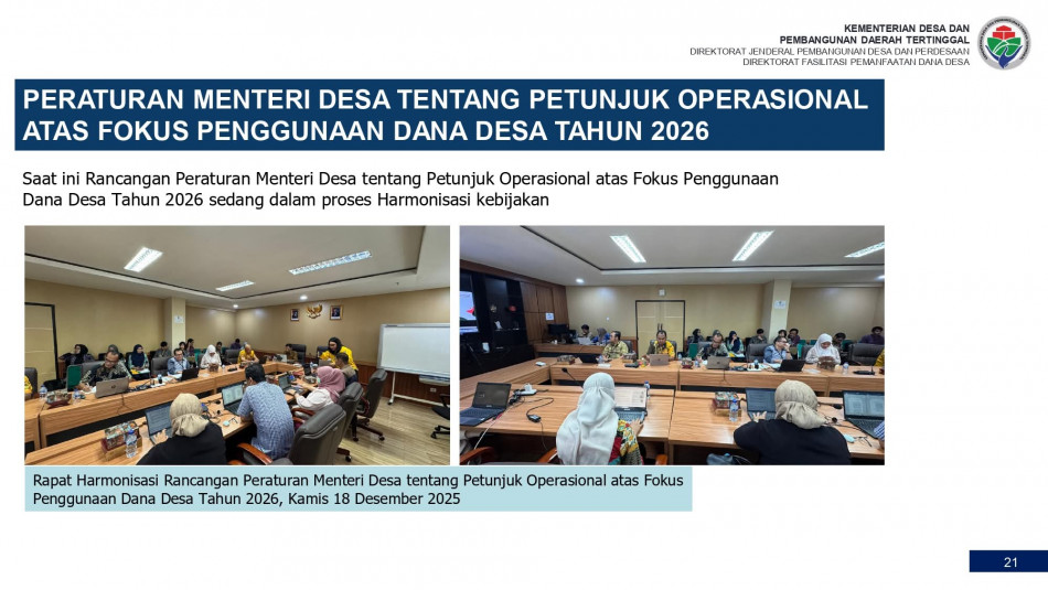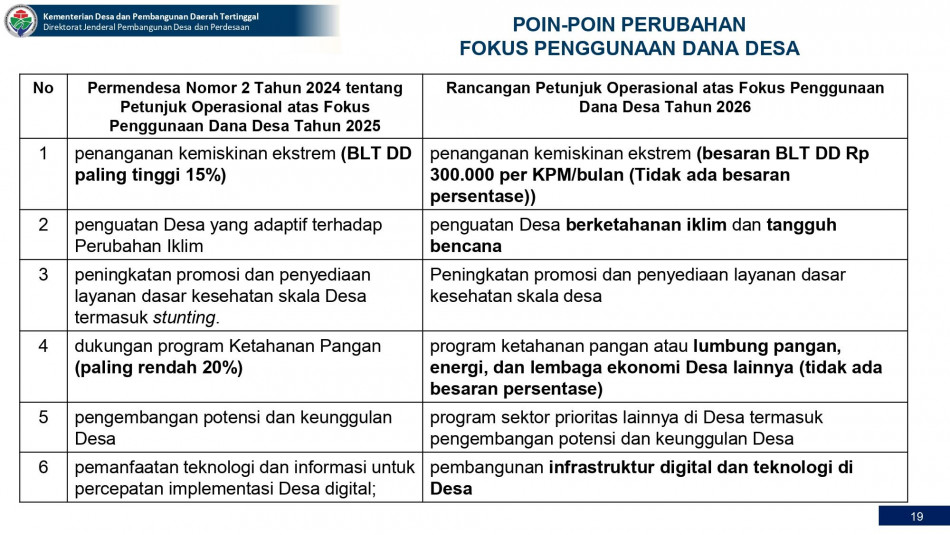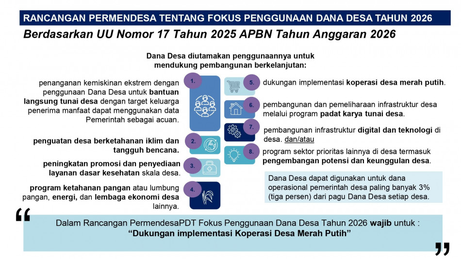 (tosari.kendalkab.go.id - 30/12/2025) Rancangan Permendes (Peraturan Menteri Desa) 2026 berfokus pada penguatan ekonomi desa melalui Koperasi Desa Merah Putih (KDMP), penanganan kemiskinan ekstrem, ketahanan pangan, pencegahan stunting, dan infrastruktur desa berbasis padat karya, serta mendukung program Desa Digital dan Program TEKAD, dengan aturan penggunaan Dana Desa yang lebih terarah dan partisipatif untuk mencapai target SDGs Desa. Aturan ini akan mengubah prioritas kegiatan desa, dengan porsi Dana Desa sekitar Rp 40 triliun dialokasikan untuk KDMP selama 6 tahun ke depan.