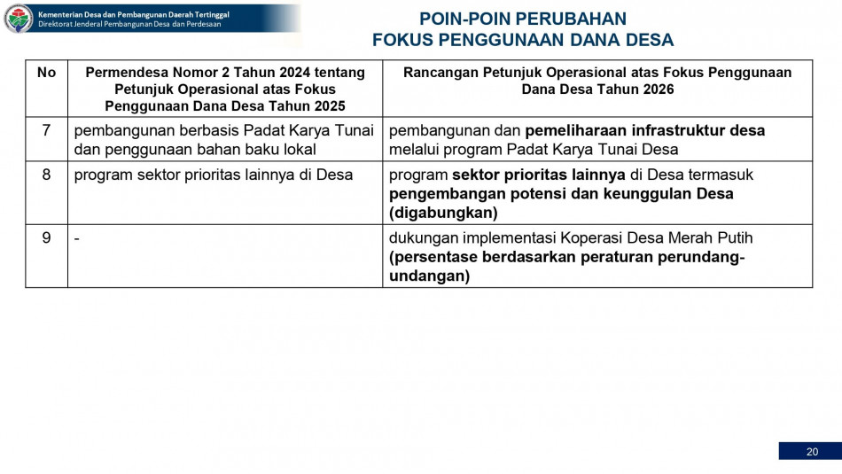 Koperasi Desa Merah Putih (KDMP): Dana Desa wajib mendukung pembangunan KDMP sebagai motor penggerak ekonomi lokal, dengan alokasi signifikan untuk membangun 80.000 unit KDMP.